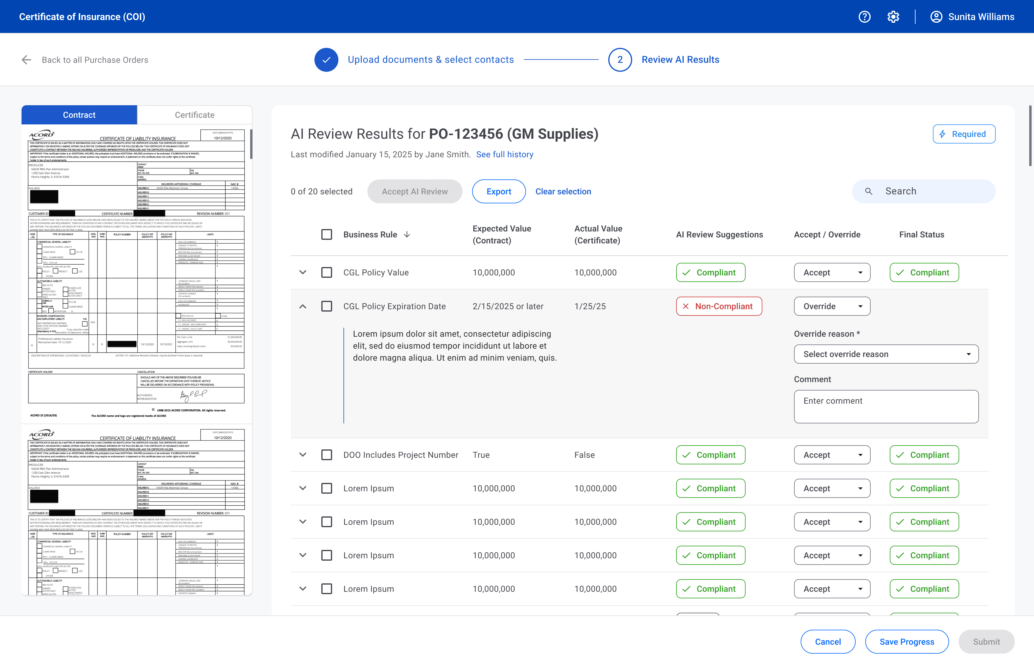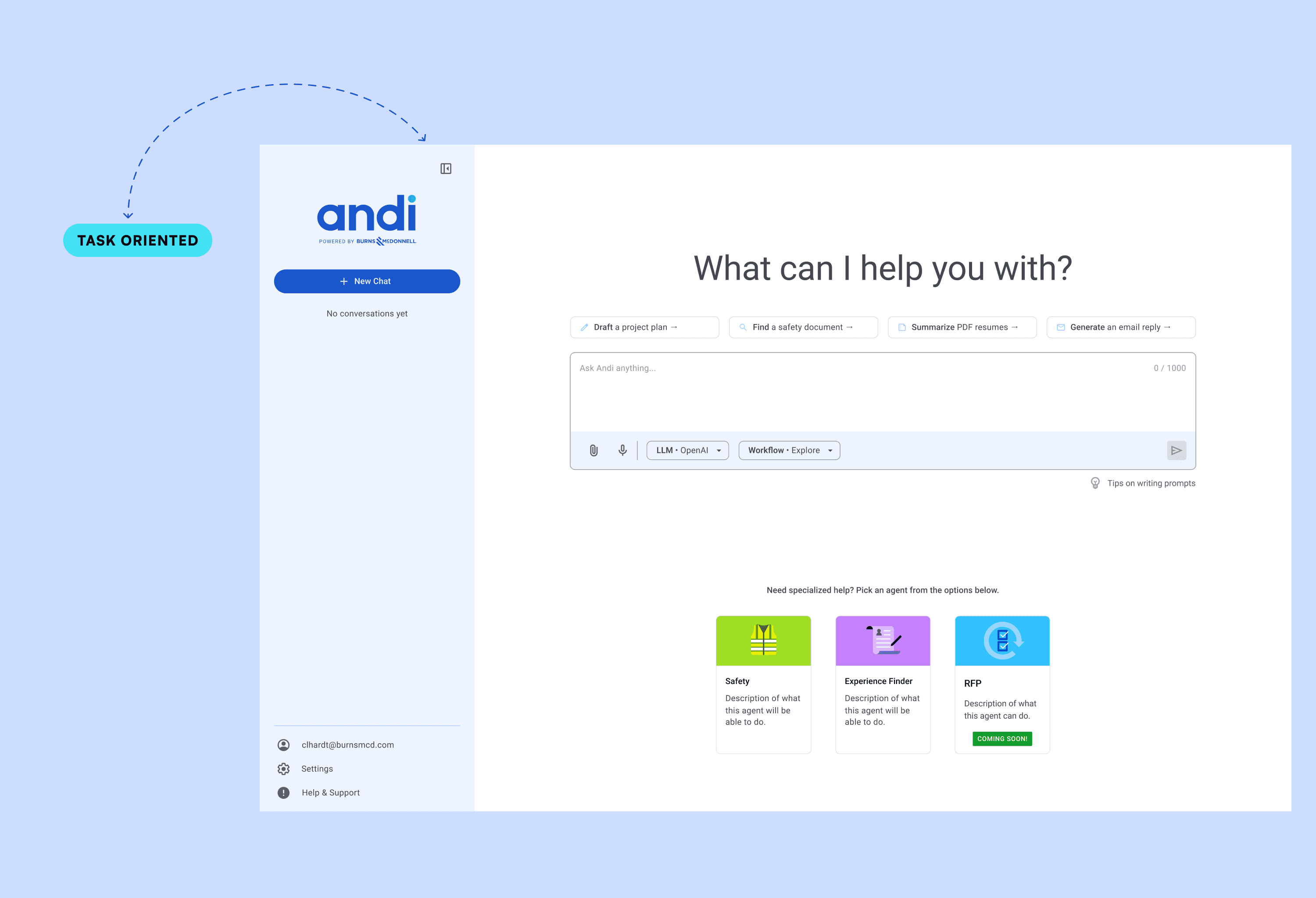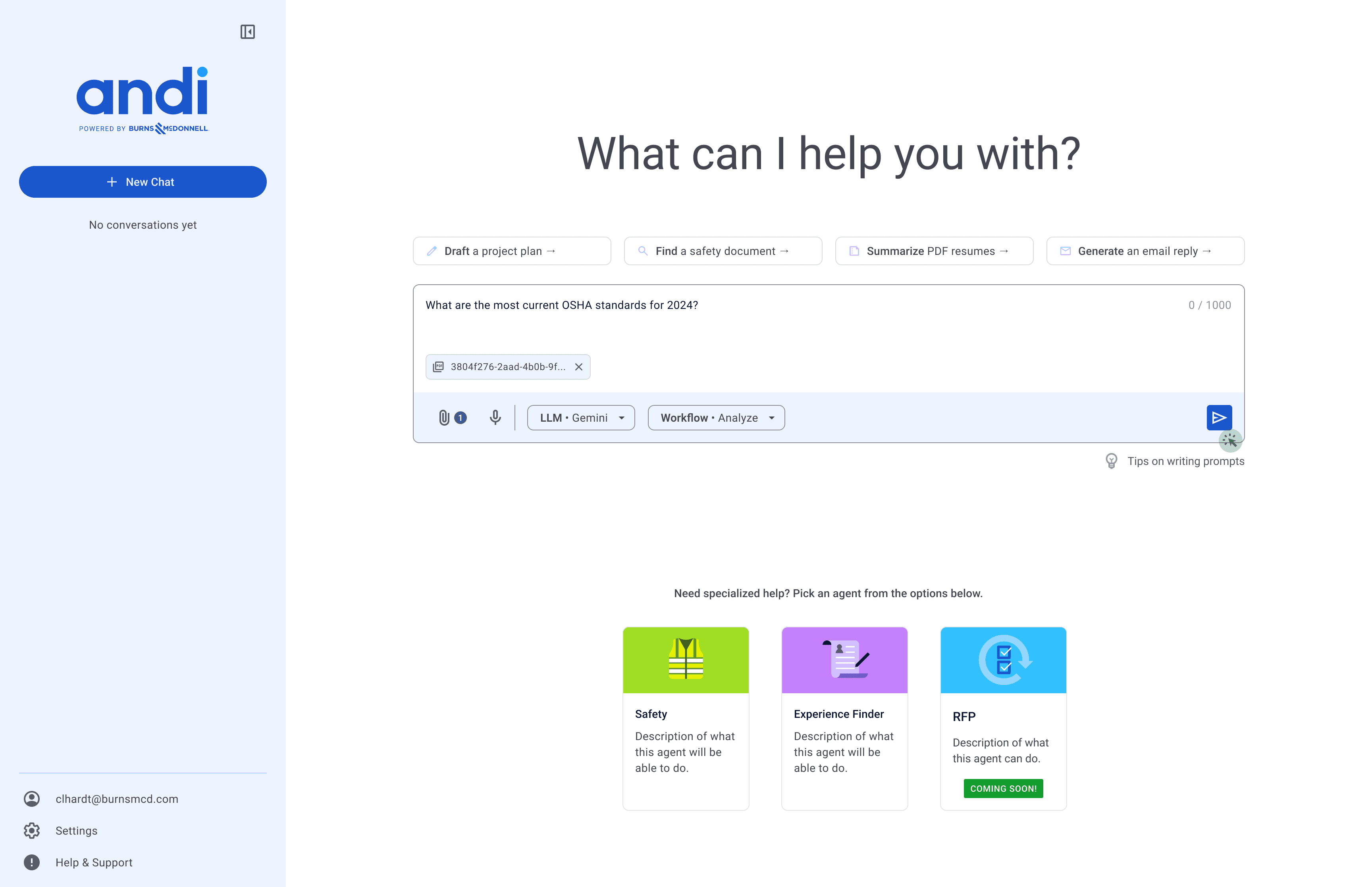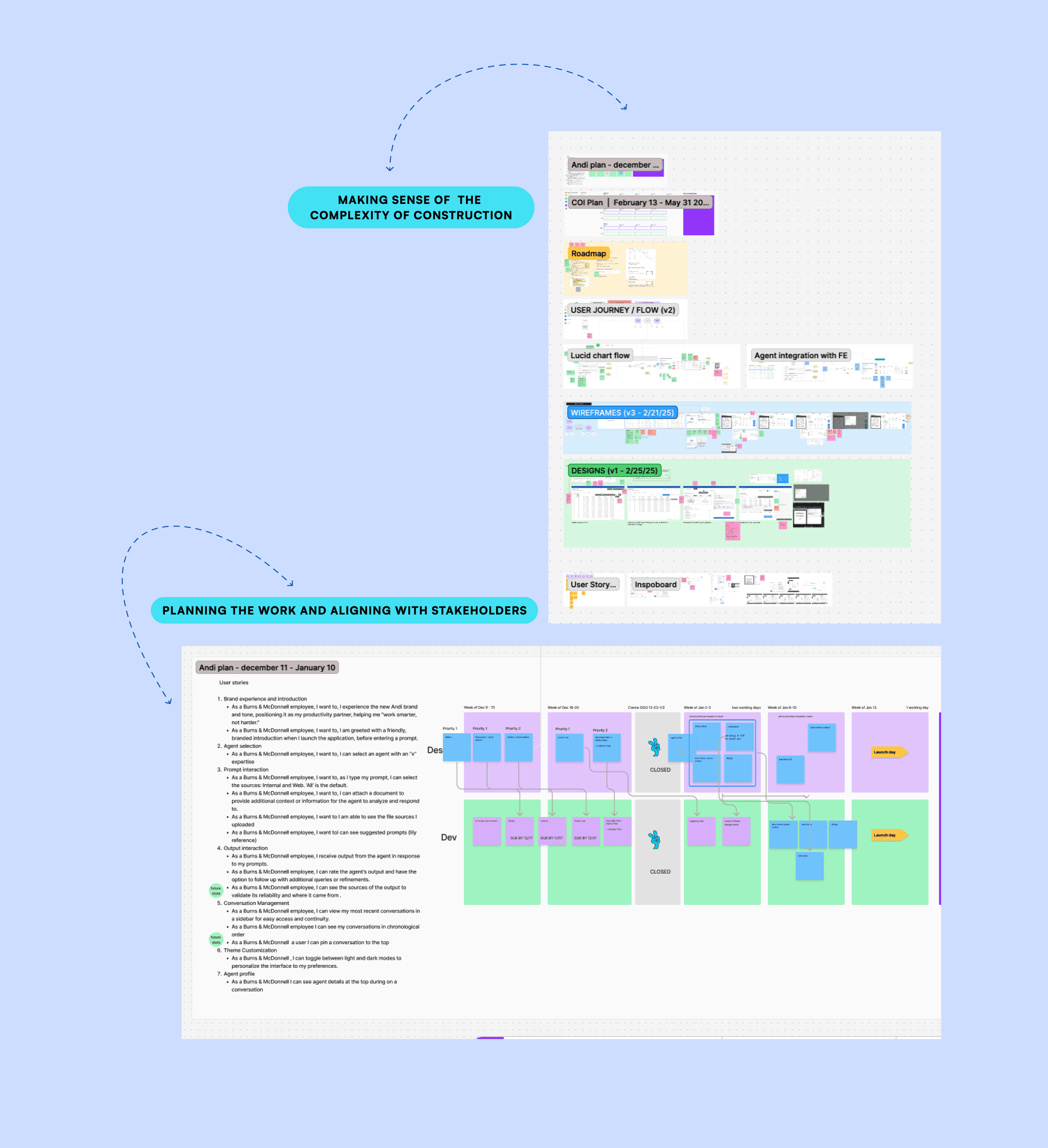 In late 2024, I led UX strategy and execution for two AI-enabled internal tools at a leading engineering and construction firm. The work introduced practical, trust-centered AI experiences into daily operations—helping teams access institutional knowledge faster and identify insurance compliance gaps more efficiently, while laying the foundation for broader agent-based automation.