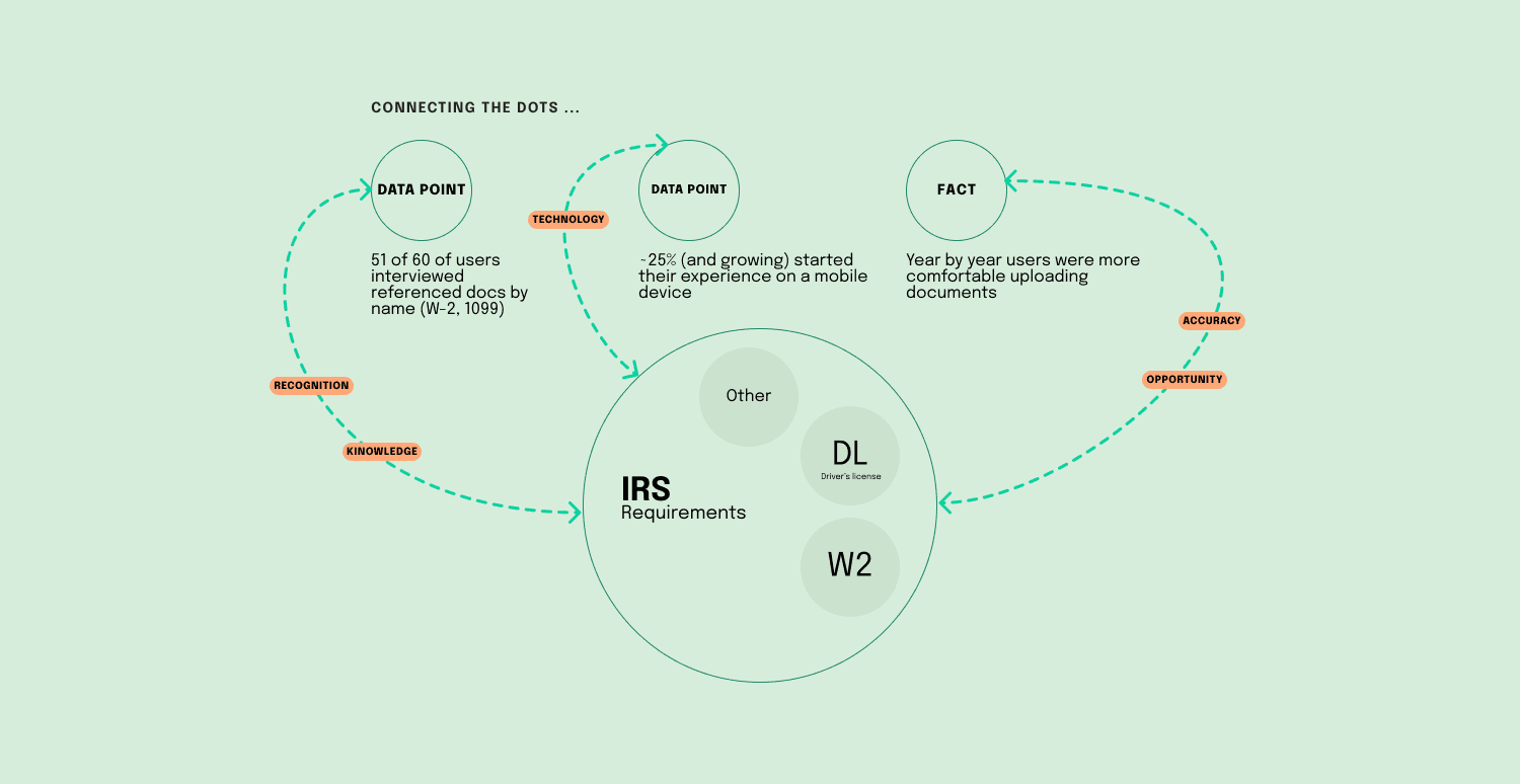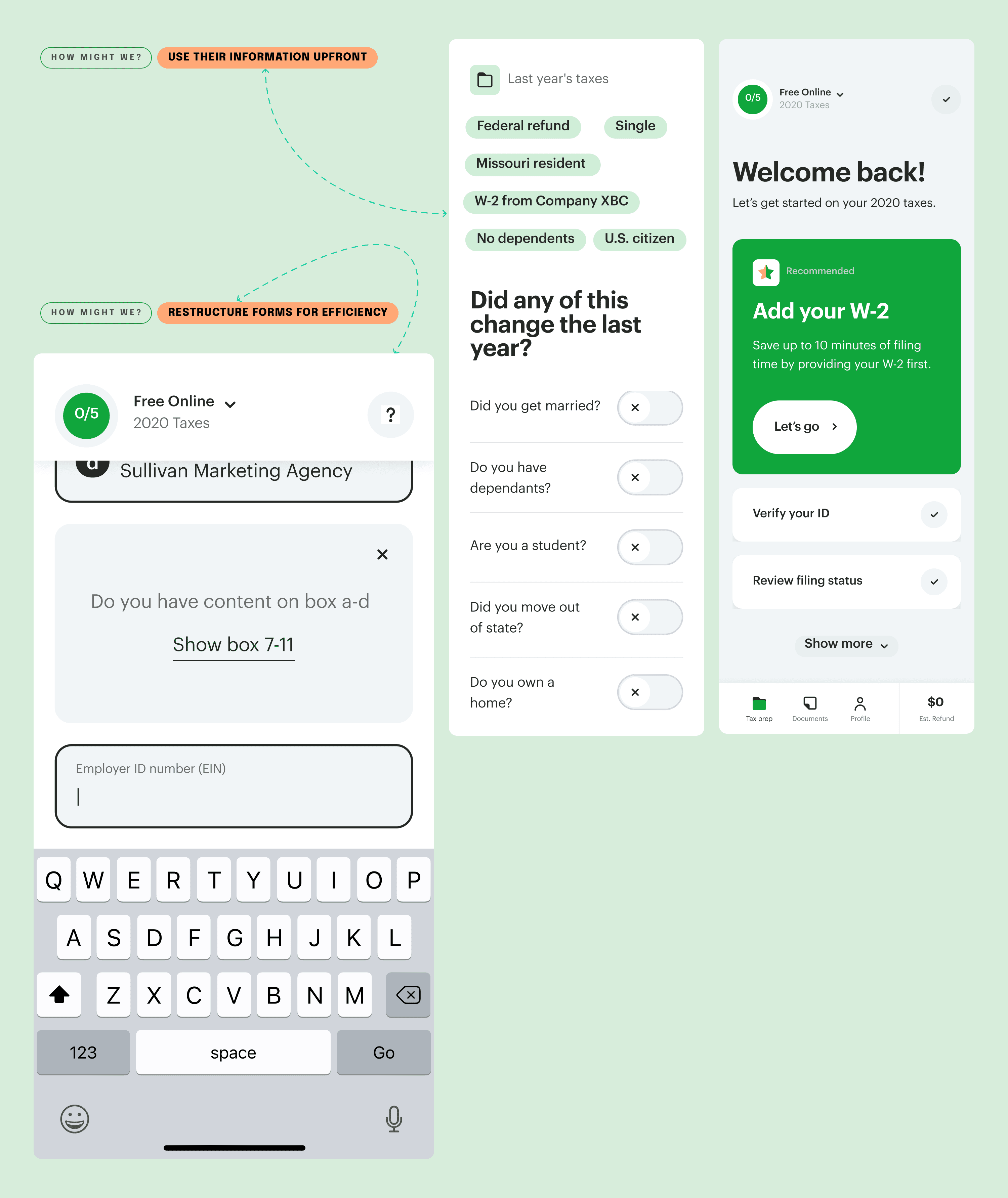 I partnered with the DIY Tax product team during a period of organizational and design system transformation. My focus was on connecting the data already collected from users to reduce unnecessary questioning, reinforce confidence, and guide users through the process with clarity.